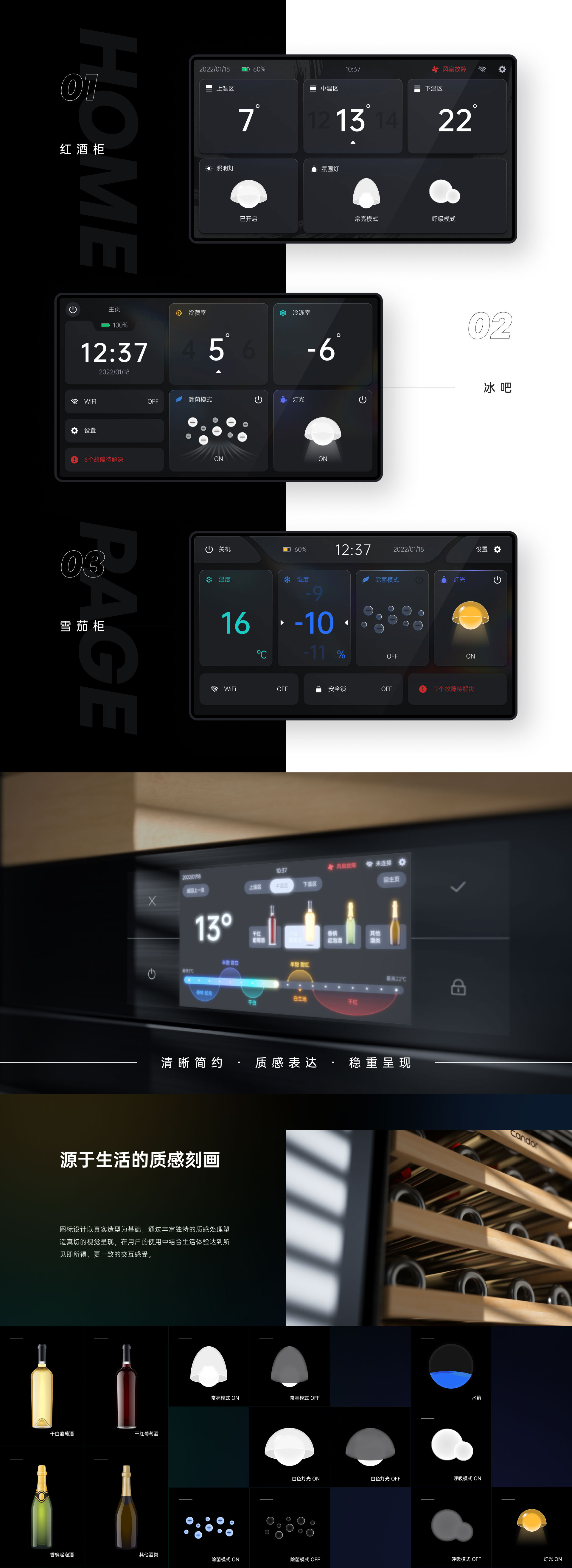 经过前期对品牌与视觉的详细调研,结合candor凯得对产(chǎn)品视觉一體(tǐ)化的需求与理(lǐ)念,HOLY荷勒先后為(wèi)酒柜、冰吧、雪(xuě)茄柜等产(chǎn)品智能(néng)面板深度打造互联互通、一触即达的优秀交互體(tǐ)验设计与用(yòng)户界面设计,提供更全面、通用(yòng)、可(kě)延续的设计方案。