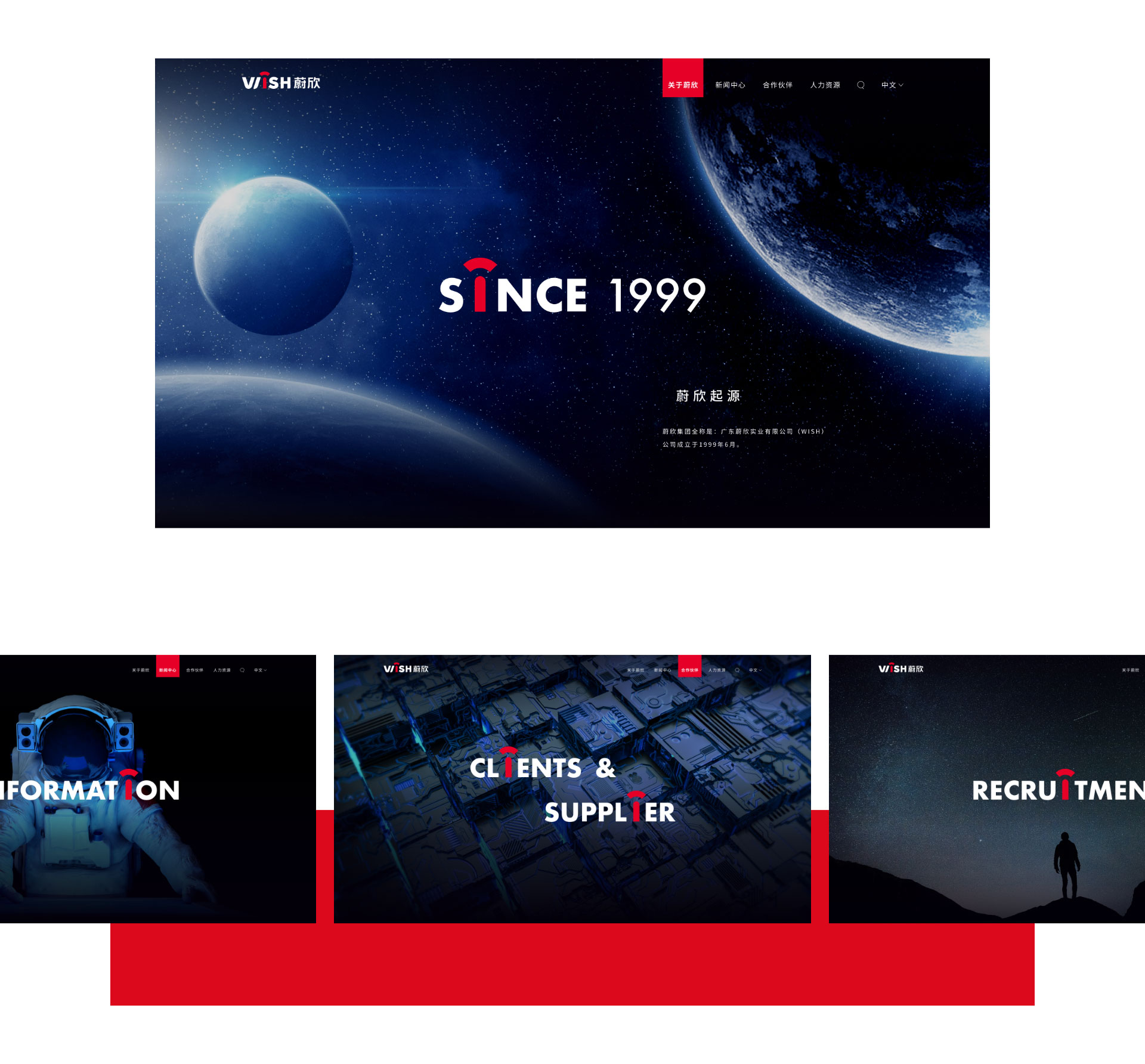 网站整體(tǐ)使用(yòng)暗色的设计,用(yòng)星空蓝色為(wèi)色彩的大背景,渲染集团的先进科(kē)技(jì )感氛围,且能(néng)更好地呈现网站的创意化设计,凸显企业的品牌化与个性化。