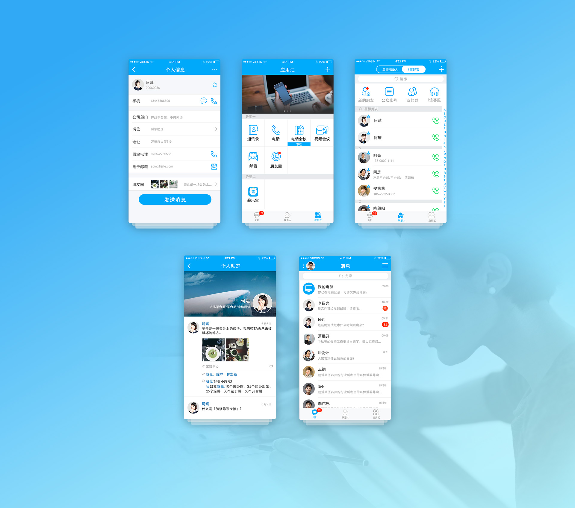 界面设计秉承着清新(xīn),商(shāng)務(wù)的风格,蓝色有(yǒu)理(lǐ)性、商(shāng)務(wù)的感觉,大面积的留白,少量的红色点缀提醒,使用(yòng)户在繁忙时使用(yòng)软件会有(yǒu)舒适轻松的感觉。